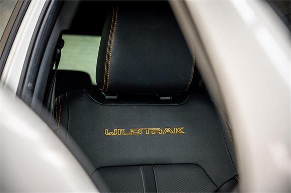 Cyber Orange stitching and Wildtrak logo on perforated ebony leather seats