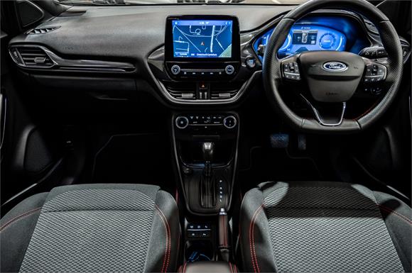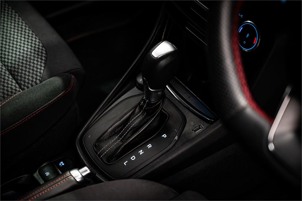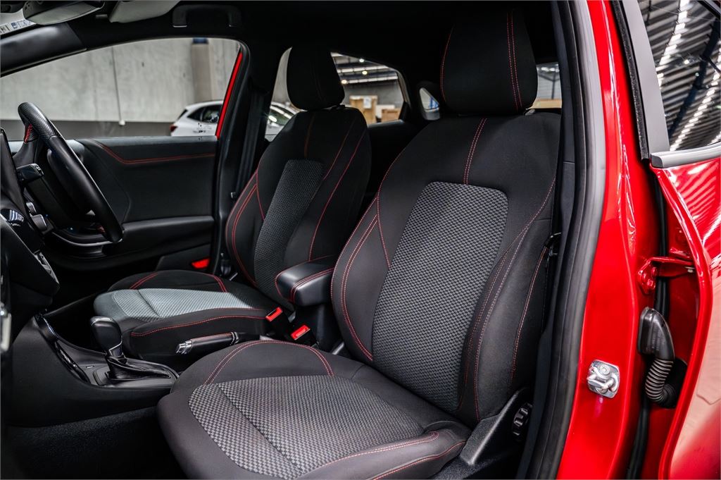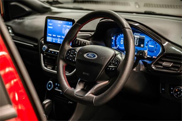 The Puma's ST-Line adds a unique sporty flair with a 12.3-inch full-colour digital instrument cluster, a flat-bottom ST-Line leather steering wheel with Race Red stitching, and 17-inch five-spoke alloy wheels. The ST-Line design features a matte black grille, front apron, side skirts, rear apron treatment, and an integrated rear spoiler. The interior boasts ST-Line sports suspension, Race Red stitching on the dash, door trim, and gear selector, and ST-Line sports seats with red stitching.